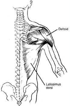The latissimus dorsi (also known as the "lats"), lie across the middle section of the back on each side. This muscle group when well developed gives the upper body that V shape. The lats originates from attachments along the spine and inserts with a large tendon to the humerus (upper arm bone) on each side of the body.